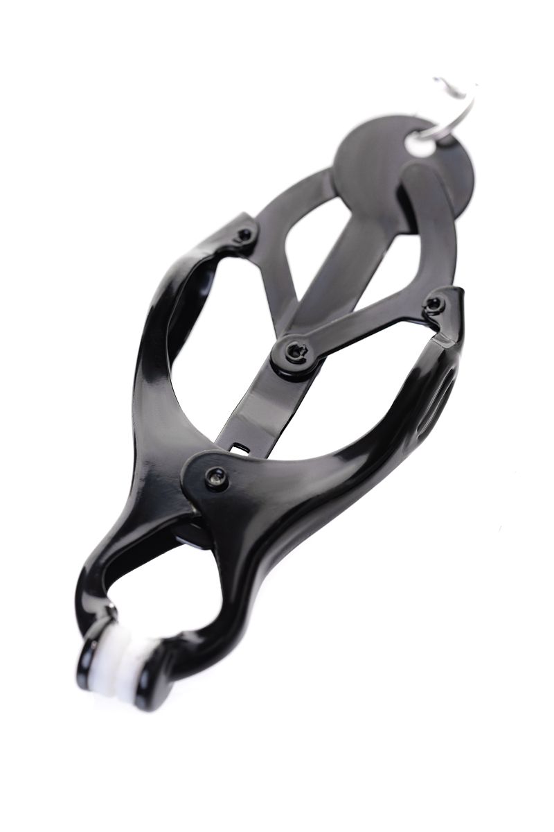 Мужская версия зажимов для воздействия на соски. Конструкция с пружинным механизмов - один из самых жестких вариантов. Дополнительное ограничение свободы обеспечивает мягкое кольцо на пенис. Длина сцепки - 48,5 см. Длина зажимов - 9 см. Диаметр кольца - 3,5 см.