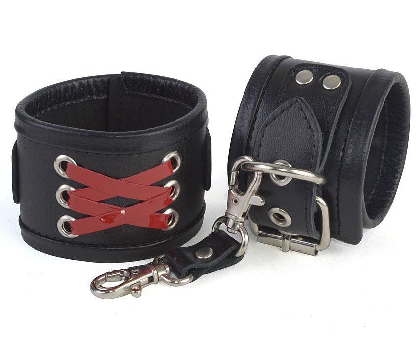 Аксессуар состоит из двух широких полос из плотной натуральной высококачественной кожи черного цвета, украшенных контрастной шнуровкой из красных лаковых лент, соединенных между собой снимающейся короткой сцепкой в виде карабинов. По краю наручников проходит оторочка, обеспечивающая комфорт при ношении. Оденьте наручники на запястья и с помощью никелированных пряжек зафиксируйте ремни. Ширина - 5,3 см.