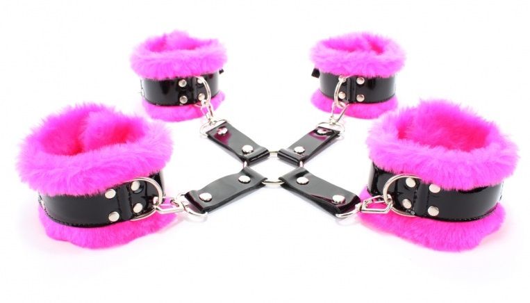 Если Вам нравится доминировать во время сексуальных игр, то этот стильный набор, просто создан для удовлетворения именно таких потребностей. Изящный секс-девайс не оставит равнодушной даже очень требовательную партнершу. Благодаря безопасным материалам, бандаж не травмирует кожу и не причиняет дискомфорта. Изделие украшено роскошным мехом и лаковыми деталями, что особенно привлекает девушек. Оковы соединяются между собой карабинами.